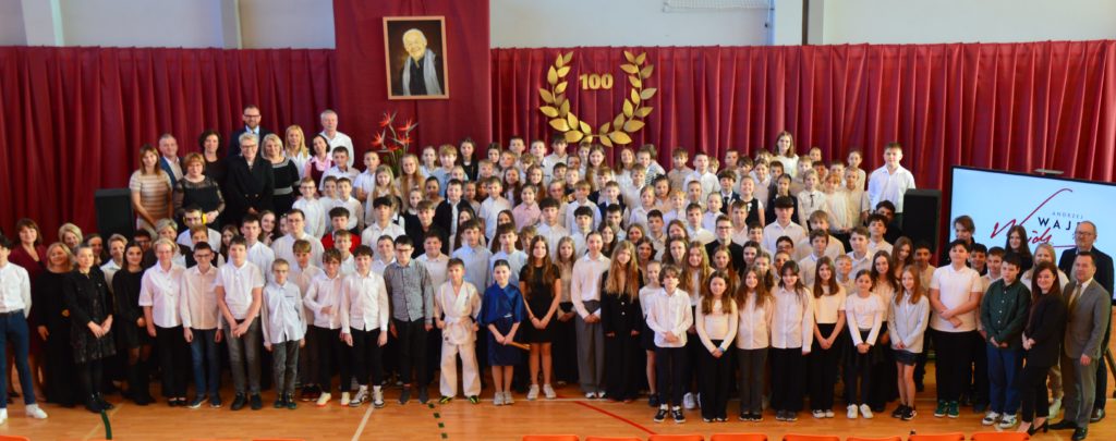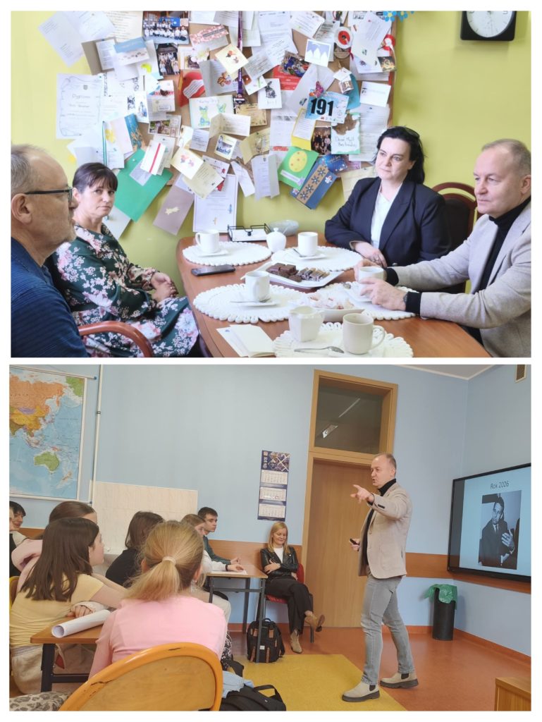 Okazją do odwiedzin była zbliżająca się setna rocznica urodzin naszego Patrona. Goście przeprowadzili prelekcję na temat patronów poszczególnych lat, a przede wszystkim patrona 2026 roku – Andrzeja Wajdy. Nasi uczniowie zostali pochwaleni za wiedzę i aktywność na spotkaniu.