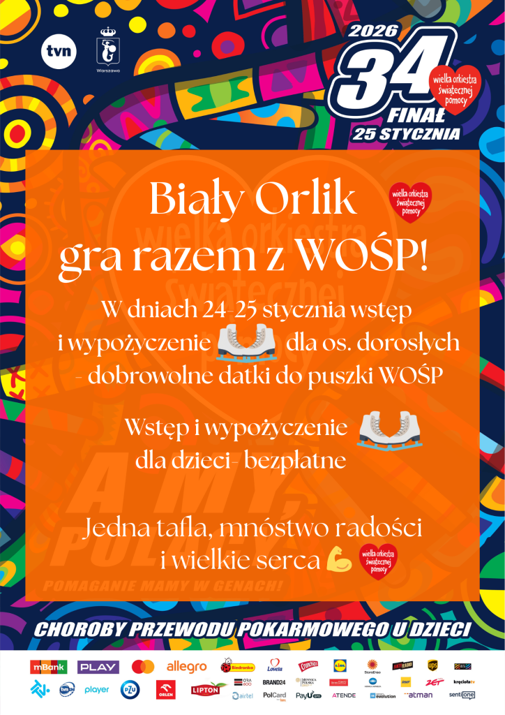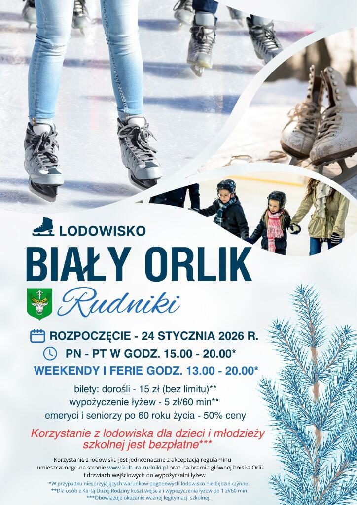 Wyprzedzamy ferie zimowe o tydzień i już od najbliższej soboty (24.01) zapraszamy na lodowisko Biały Orlik w Rudnikach Lodowisko podczas weekendów i ferii zimowych (2-15.02) czynne będzie w godz. 13-20, a w tygodniu jeszcze przed feriami w godzinach 15-20. Wtorki i piątki rezerwacja dla sekcji hokejowej od godz. 19:00-20:00. W dniach 24-25 stycznia wstęp i wypożyczenie łyżew-dobrowolne datki do puszki WOŚP.