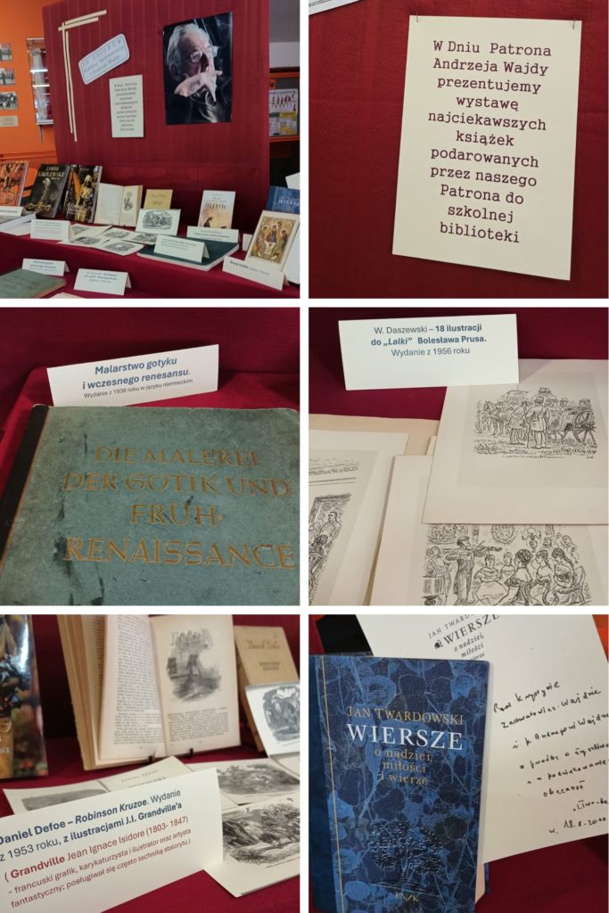 Po raz kolejny obchodzimy w szkole Dzień Patrona. Z tej okazji została przygotowana i zaprezentowana na szkolnym korytarzu wystawa najciekawszych książek podarowanych przez Patrona naszej szkole. Andrzej Wajda, wraz z małżonką Krystyną Zachwatowicz, w latach 2010-2015 przekazali do szkolnej biblioteki łącznie 650 książek ze swoich prywatnych zbiorów.